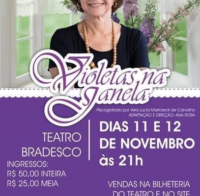 O espetáculo “Violetas na Janela” é uma adaptação do livro homônimo de Vera Lúcia Marinzeck de Carvalho. Adaptada para o teatro por Ana Rosa e dirigida pela mesma com o ator Guilherme Correa, a montagem trata da vida após a morte a partir do desencarne de Patrícia. Tudo com uma leveza e toques de humor que se encarregam de dar graça ao espetáculo. A trilha sonora foi composta especialmente por Claudio Suisso. Os vinte atores que se revezam em cena são mais um atrativo para o público.